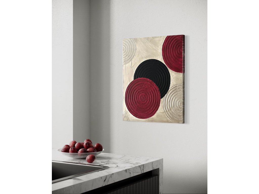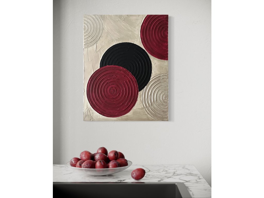 Dynamická hra tvarů a textur. 3D kruhy a vzorce vytvořené v pastě se prolínají na béžovém podkladu s akcenty černé a červené. Obraz zachycuje pohyb, harmonii a hravý rytmus abstraktních forem.