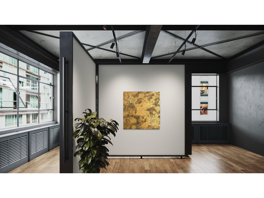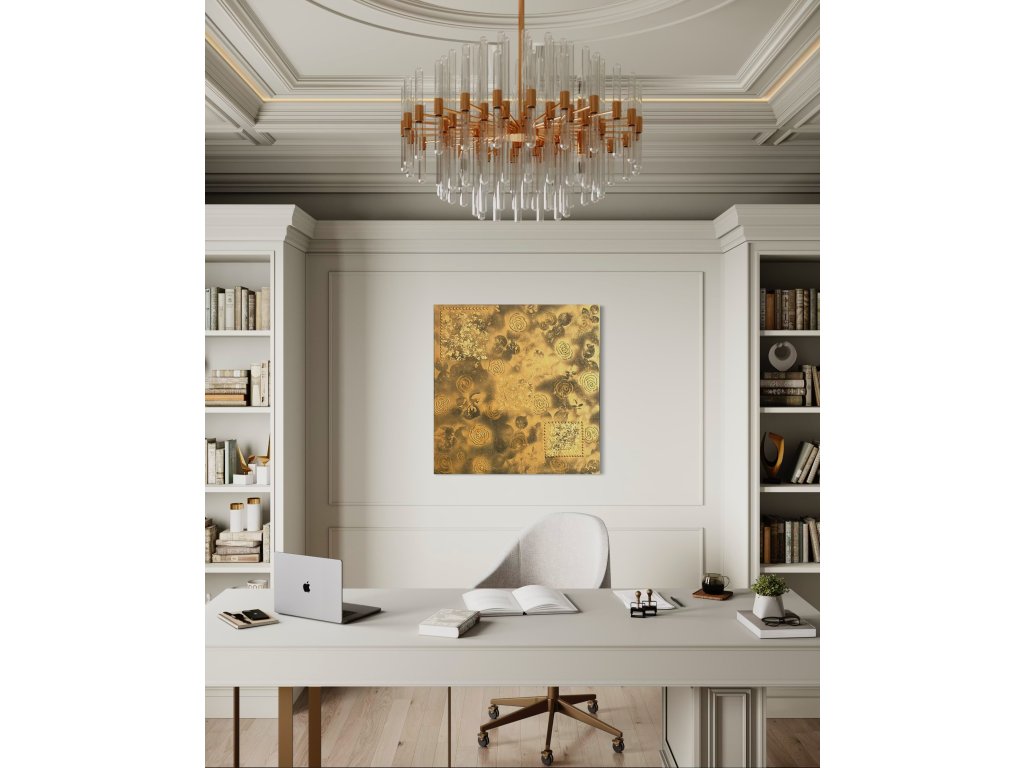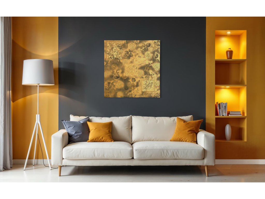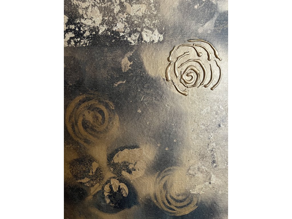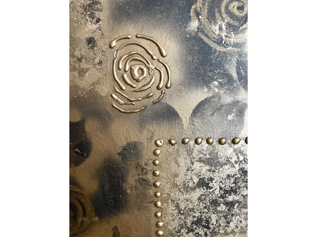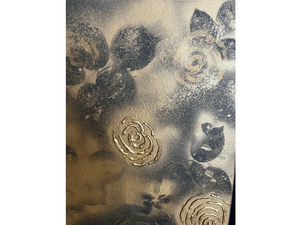 Umělecká hra světla a stínu. Zlaté tóny, černé podtóny a plastické růže vytvářejí dojem hloubky a luxusu. Ideální pro moderní interiér s duší. Ručně tvořené 3D růže a jemně prostupující černá dodávají dílu dramatický i elegantní nádech.