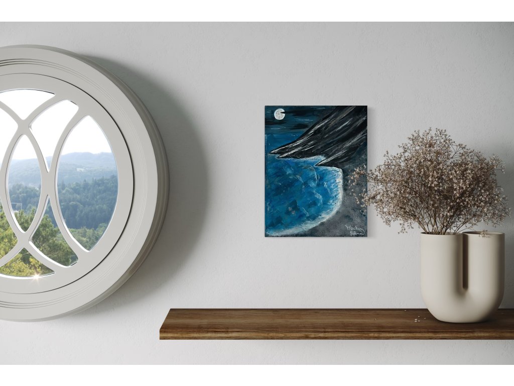 Temný oceán, černé skály a chladná modř – obraz působí tísnivě, dokud si nevšimnete jemného měsíčního svitu. Moonlight zachycuje tichý kontrast mezi temnotou a světlem, připomínající, že i noc má svůj klid a naději. Patří mezi oblíbené"kapesní obrazy".
